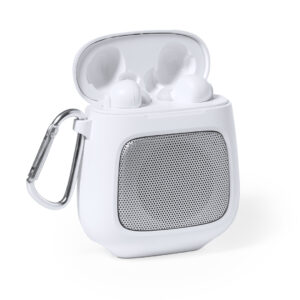 Originales auriculares altavoz con conexión Bluetooth 5.0 y fabricados resistente ABS de color blanco. El set incluye un altavoz Bluetooth de 3W de potencia