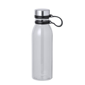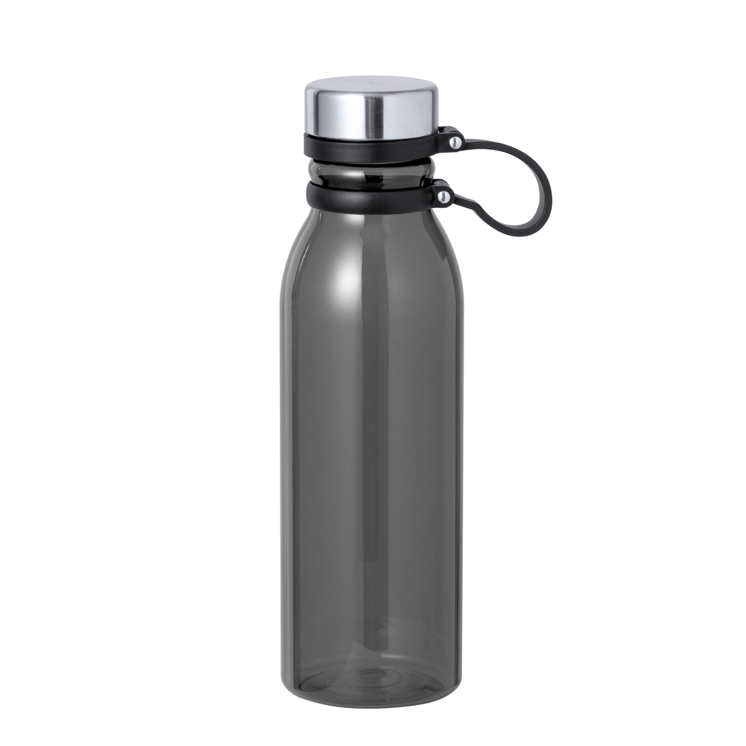 Bidón en RPET de 830 ml de capacidad. Tapón de seguridad de rosca en acero inox y original cinta de silicona para un fácil transporte. Disponible en variada gama de colores translúcidos. Libre de BPA y presentado en atractiva caja de diseño kraft. El material RPET se elabora a partir de plástico reciclado