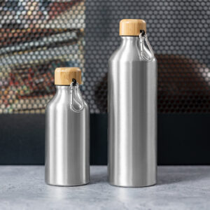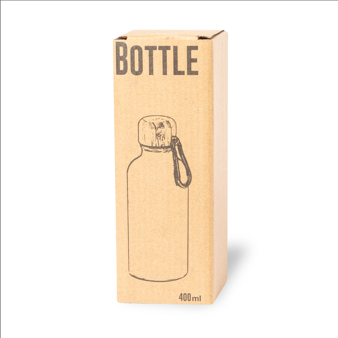 Bidón de línea nature y 400 ml de capacidad. Cuerpo en aluminio de acabado mate y tapón de bambú con mosquetón a juego para fácil transporte. Libre de BPA y presentado en atractiva caja de diseño eco.