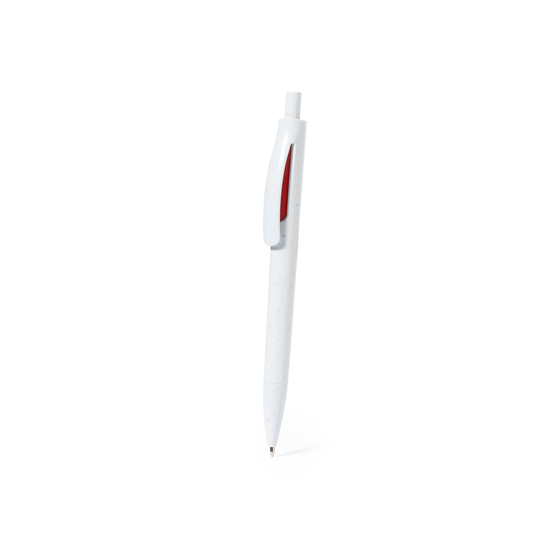 Bolígrafo de mecanismo pulsador fabricado en ABS reciclado. Con accesorios en vivos colores y cuerpo de suave acabado en color blanco sólido. Distintivo ABS reciclado en la parte superior del bolígrafo. En tinta azul.