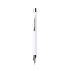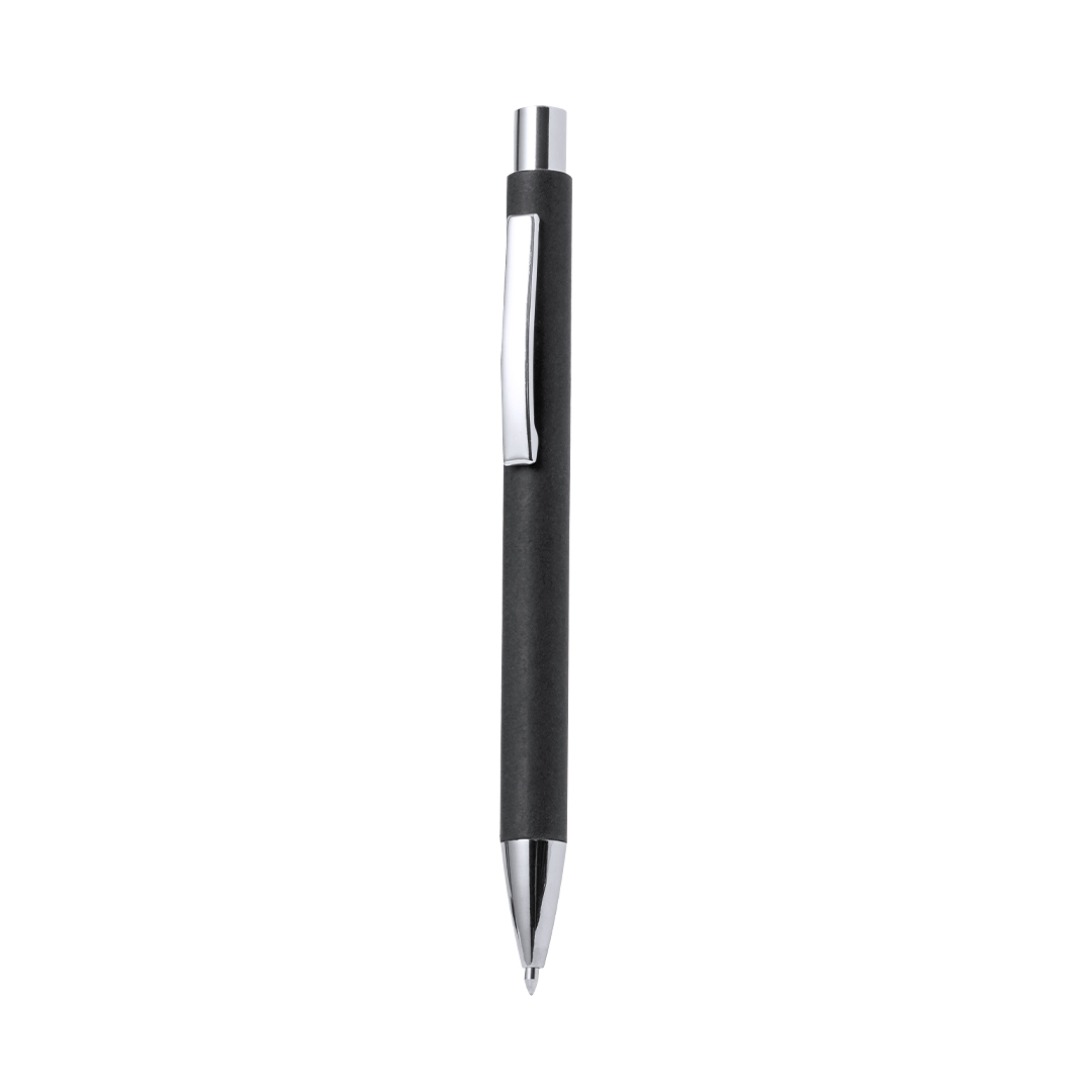 Elegante bolígrafo de mecanismo pulsador con cuerpo en papel reciclado y accesorios de acabado metálico en color plateado brillante. De tinta azul. Disponible en variada gama de colores.