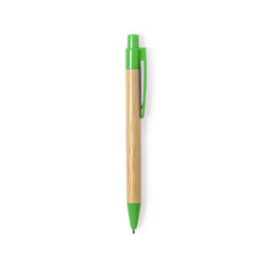 Bolígrafo de línea nature con mecanismo pulsador. Combinación de cuerpo en bambú brillo y accesorios en PLA -Ácido PoliLáctico-, que se obtiene a partir de recursos 100% naturales como el almidón de maíz, la yuca o la caña de azúcar, pudiendo convertirse en 100% compostable al final de su ciclo de vida útil. Clip con amplia superficie de marcaje y disponible en variada gama de colores, con tinta azul. Distintivo PLA en parte superior del clip.