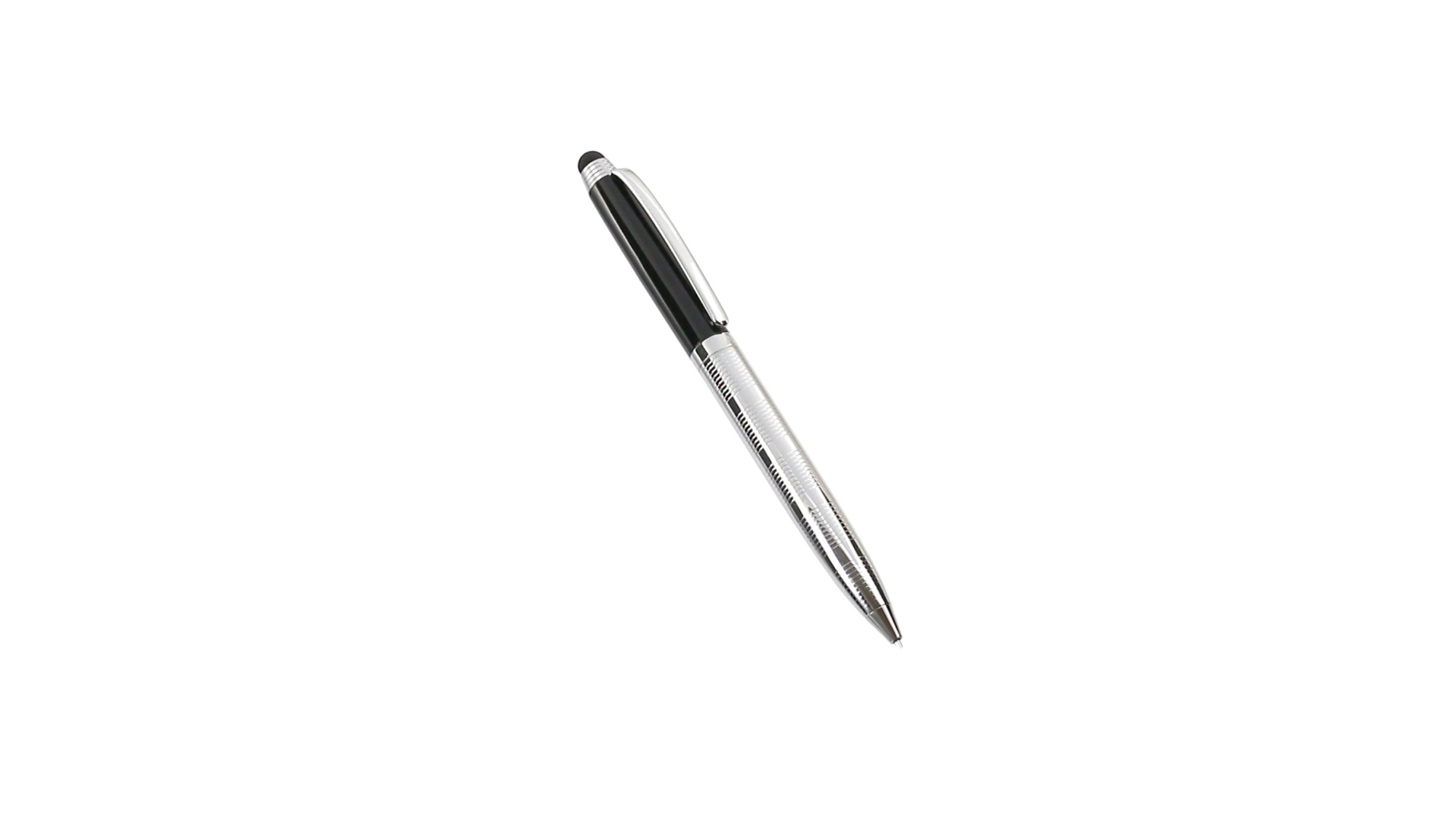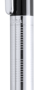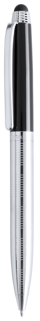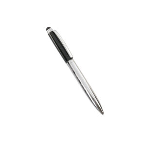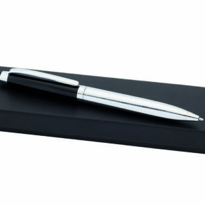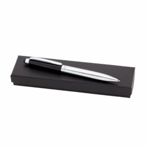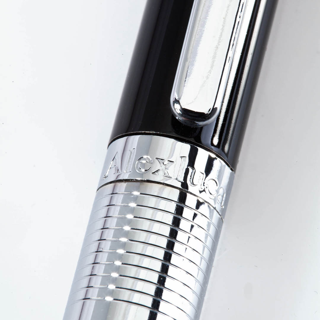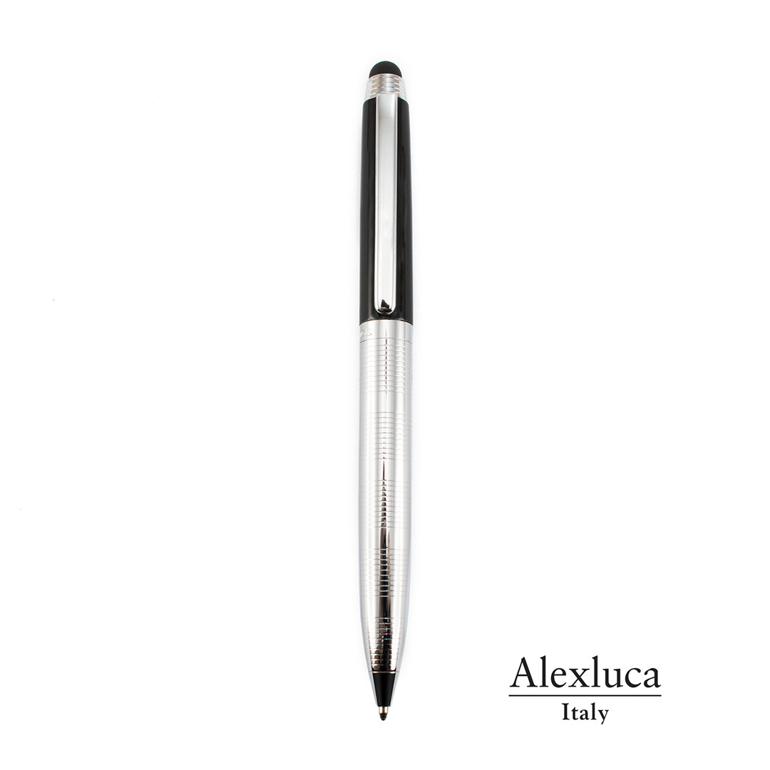 Bolígrafo puntero de Alexluca de mecanismo giratorio con suave cuerpo metálico, de elegante combinación de colores en plateado y negro. Clip y empuñadura de diseño a juego. Presentado en estuche individual negro con logotipo de la marca. Tinta azul.