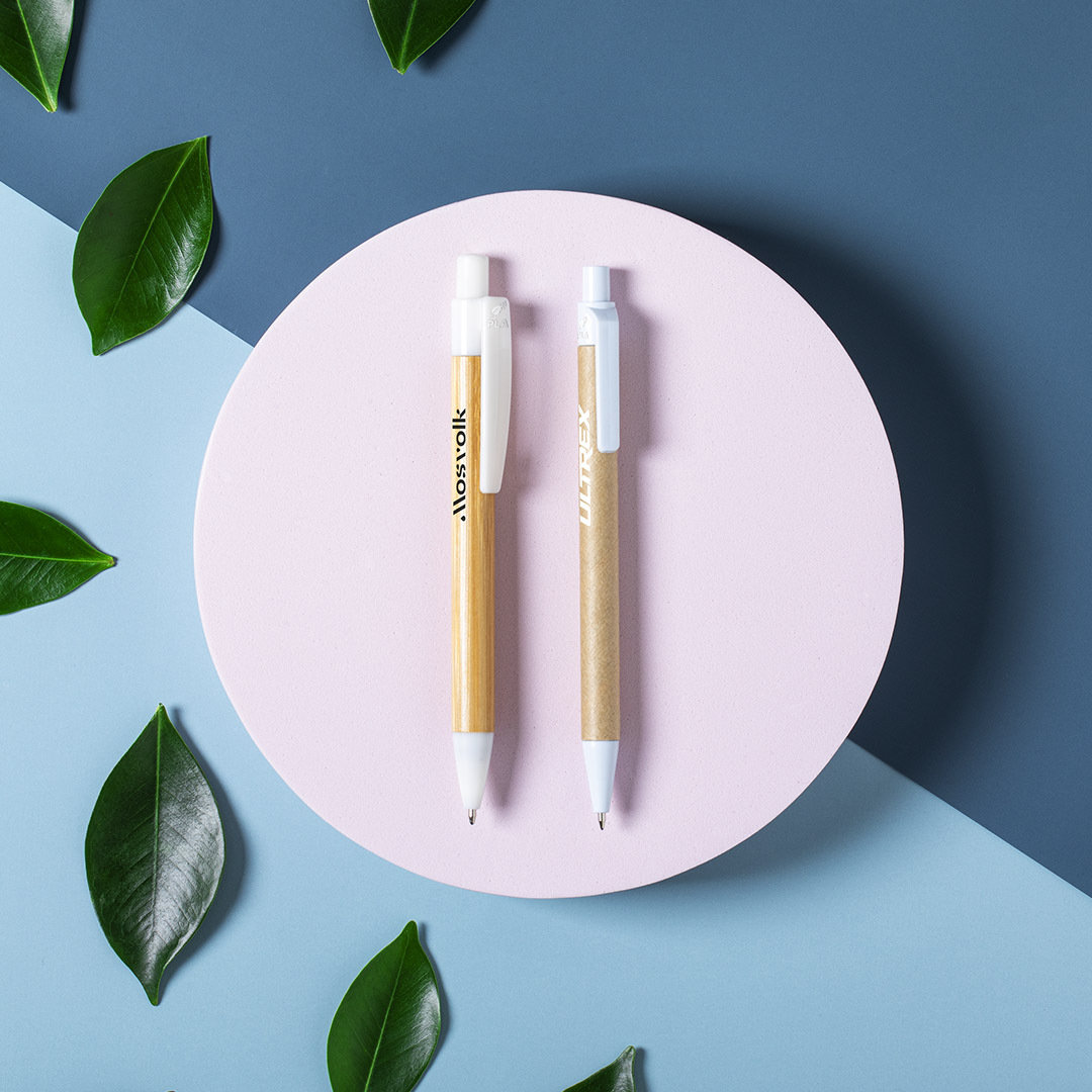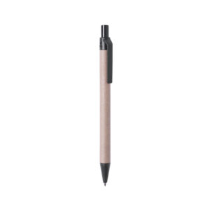 Bolígrafo de línea nature con mecanismo pulsador. Combinación de cuerpo en cartón reciclado de color natural y accesorios en PLA -Ácido PoliLáctico-, que se obtiene a partir de recursos 100% naturales como el almidón de maíz, la yuca o la caña de azúcar, pudiendo convertirse en 100% compostable al final de su ciclo de vida útil. Disponible en variada gama de colores, con tinta azul. Distintivo PLA en parte superior del bolígrafo.