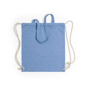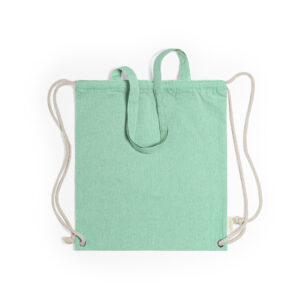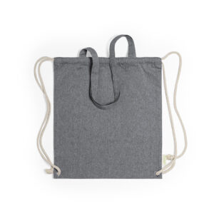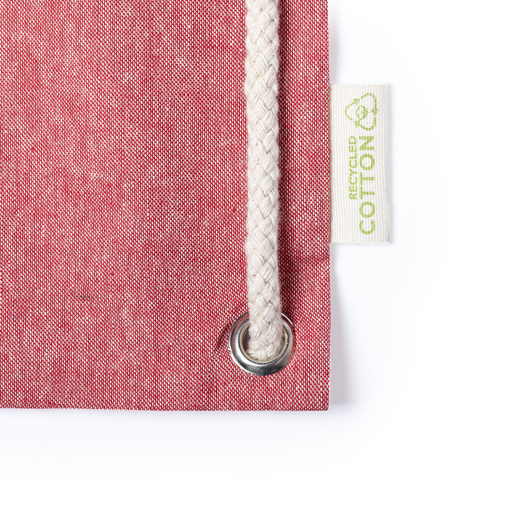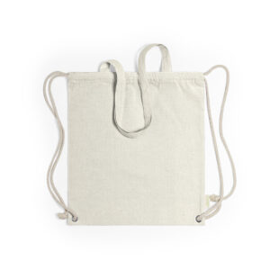 Bolsa mochila de cuerdas de línea nature, en resistente algodón reciclado de 140g/m2, con asas de transporte de 70 cm a juego. Cuerdas en algodón de color crudo, con argollas metálicas reforzadas y distintivo algodón reciclado en etiqueta. Disponible en variada gama de colores. Resistencia hasta 9kg de peso.