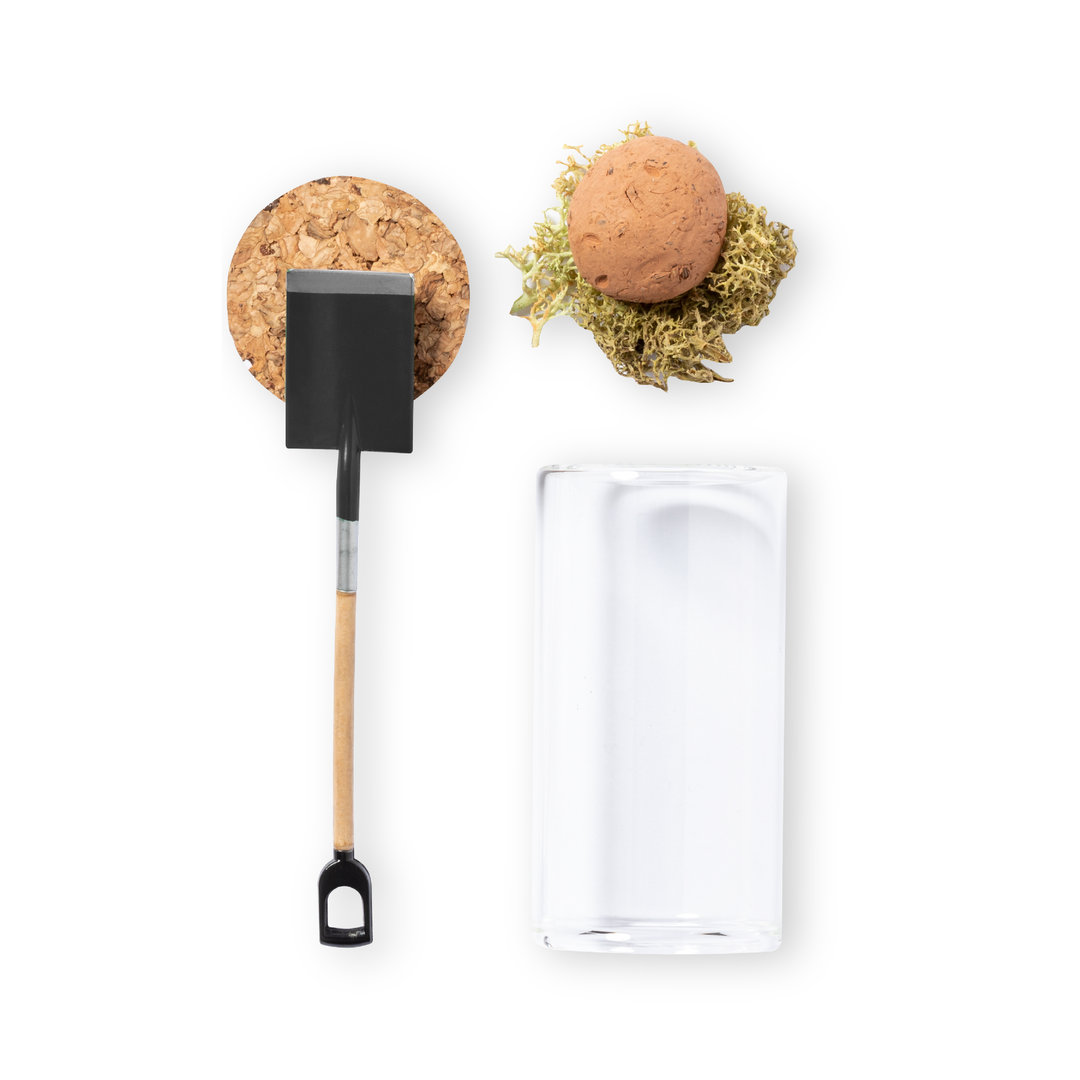 Bombón de semillas de línea nature. De flores silvestres y presentado en bote de cristal con tapón de corcho natural. Disponible en modelos rastrillo y pala.