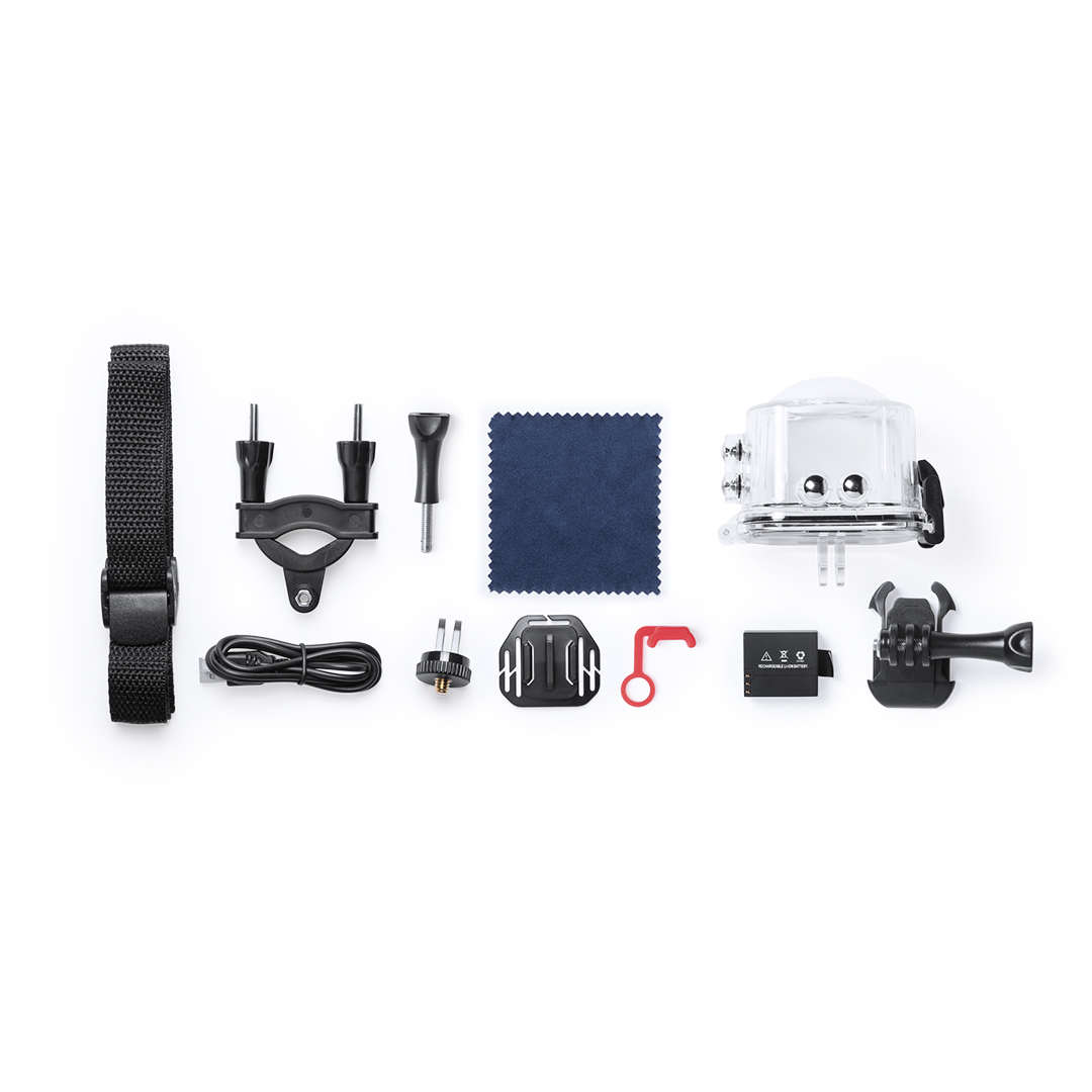 Cámara deportiva 360° de alta calidad de captura de vídeo HD 2448p, de diseño compacto y resistente, especialmente diseñada para uso intensivo. Incluye carcasa sumergible y multitud de accesorios para ajuste en casco, manillar o cinturón, así como correas ajustables para cabeza y torso. La versatilidad y resistencia de esta cámara deportiva la convierten en el gadget perfecto para capturar, con una calidad excepcional, cualquier actividad deportiva o de ocio en 360°. Con función Wi-fi, cámara de fotos Full HD 1080p, ranura para tarjetas micro USB de hasta 64 GB de capacidad, pantalla LCD de 0,96 pulgadas, sistema multilenguaje, y recargable mediante cable mini USB -incluido-. Presentada en atractiva caja de diseño.