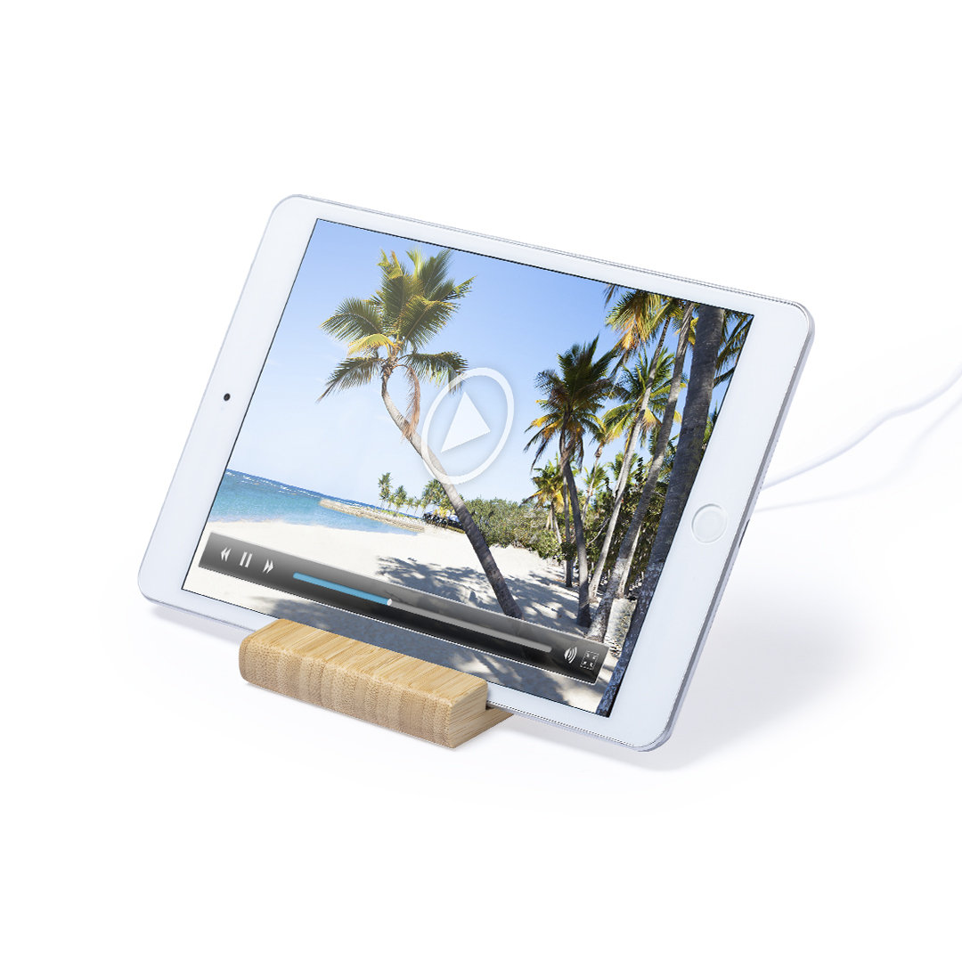 Cargador inalámbrico 15W de línea nature, con soporte integrado para smartphones y tablets. Carcasa en bambú procedente de cortes naturales. Incluye cable micro USB de 1m y es compatible con dispositivos equipados con tecnología de carga inalámbrica. Con amplia superficie de marcaje, presentado en atractiva caja de diseño eco.