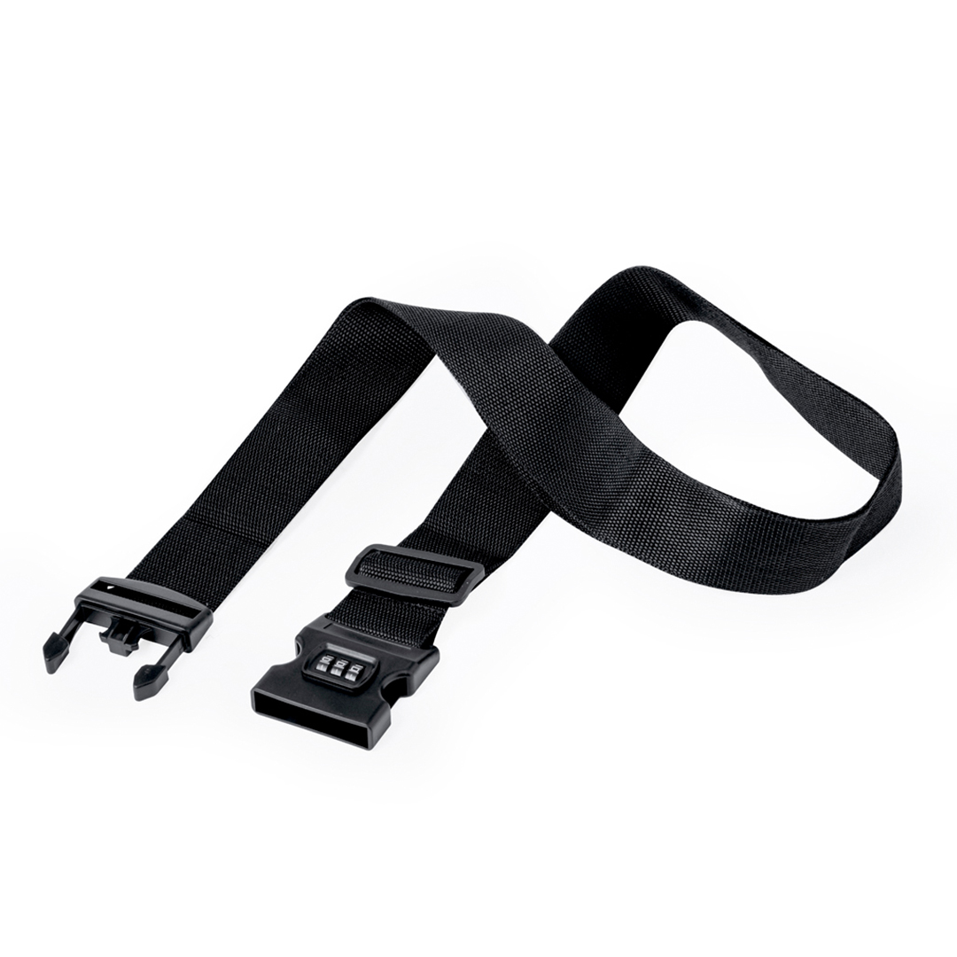Cinta para maletas ajustable fabricada en resistente poliéster. Con cierre de hebilla ajustable y contraseña de 3 cifras. En discreto color negro y de 200cm de largo. Presentada en una bolsa individual de papel reciclado.
