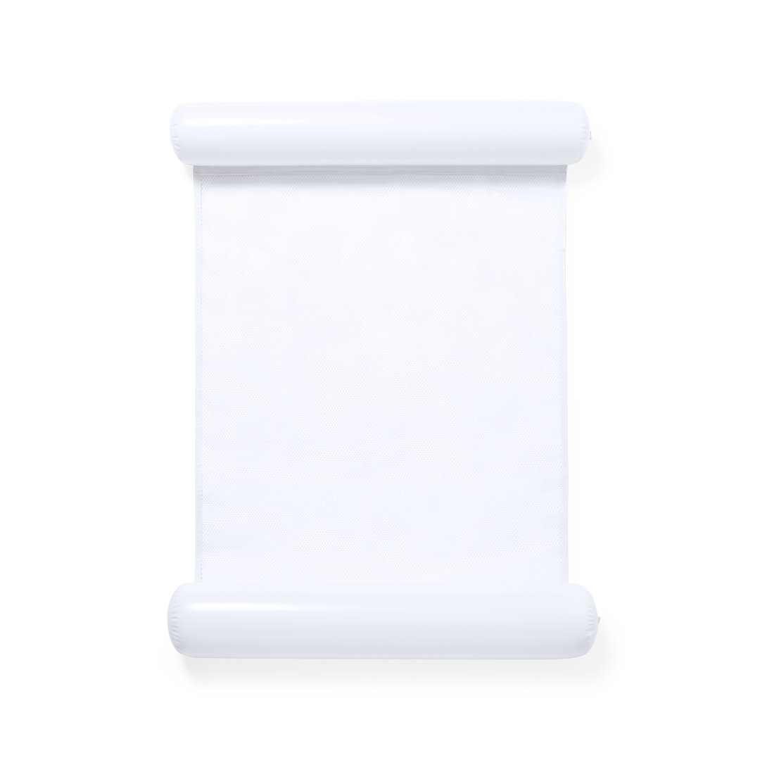 Original colchoneta con extremos hinchables en resistente PVC. Enrollable y con resistente redecilla central de 80×70 cm en poliéster de color blanco. Con plegado especial para fácil impresión y disponible en variada gama de colores.