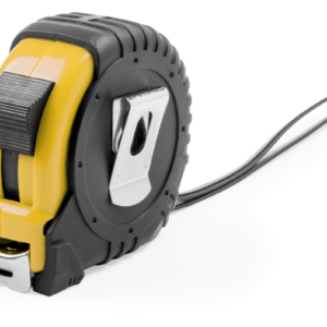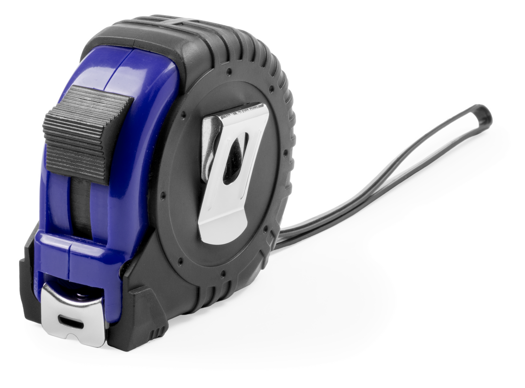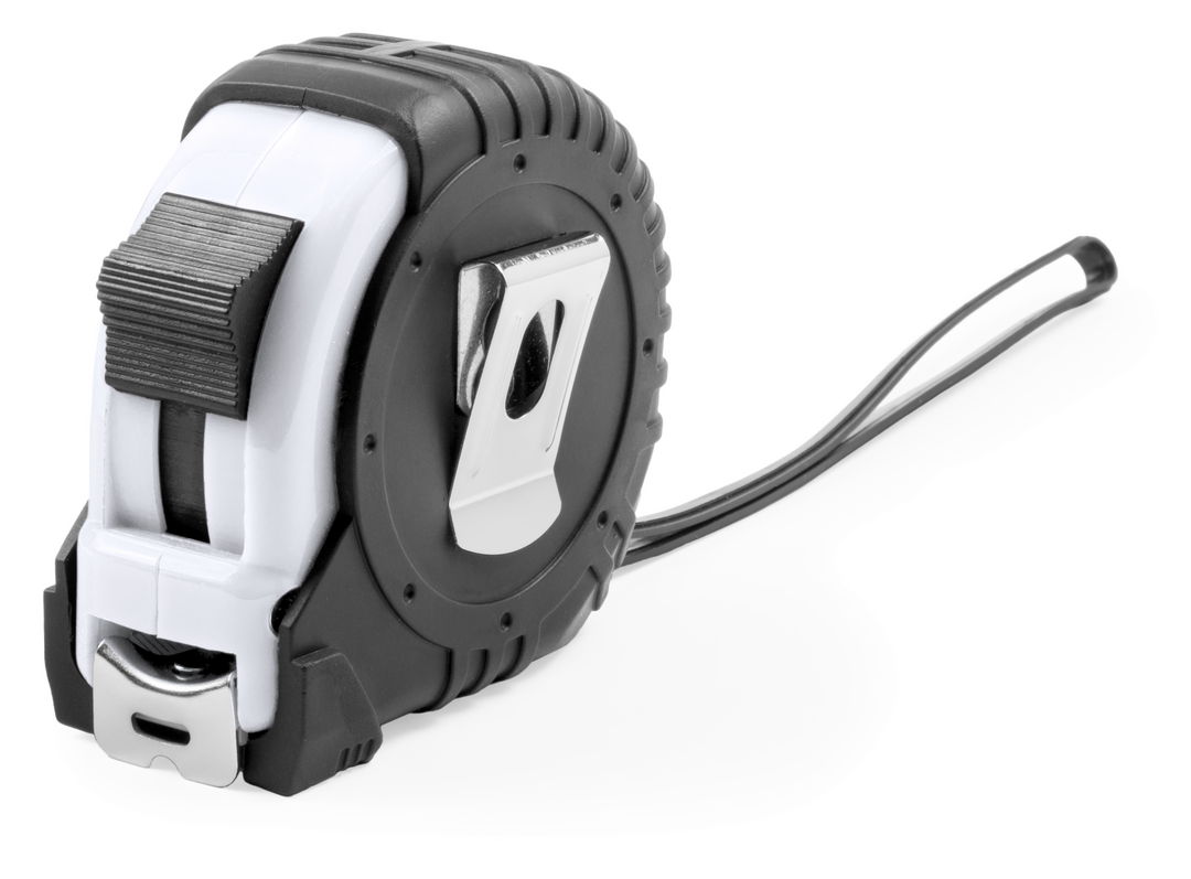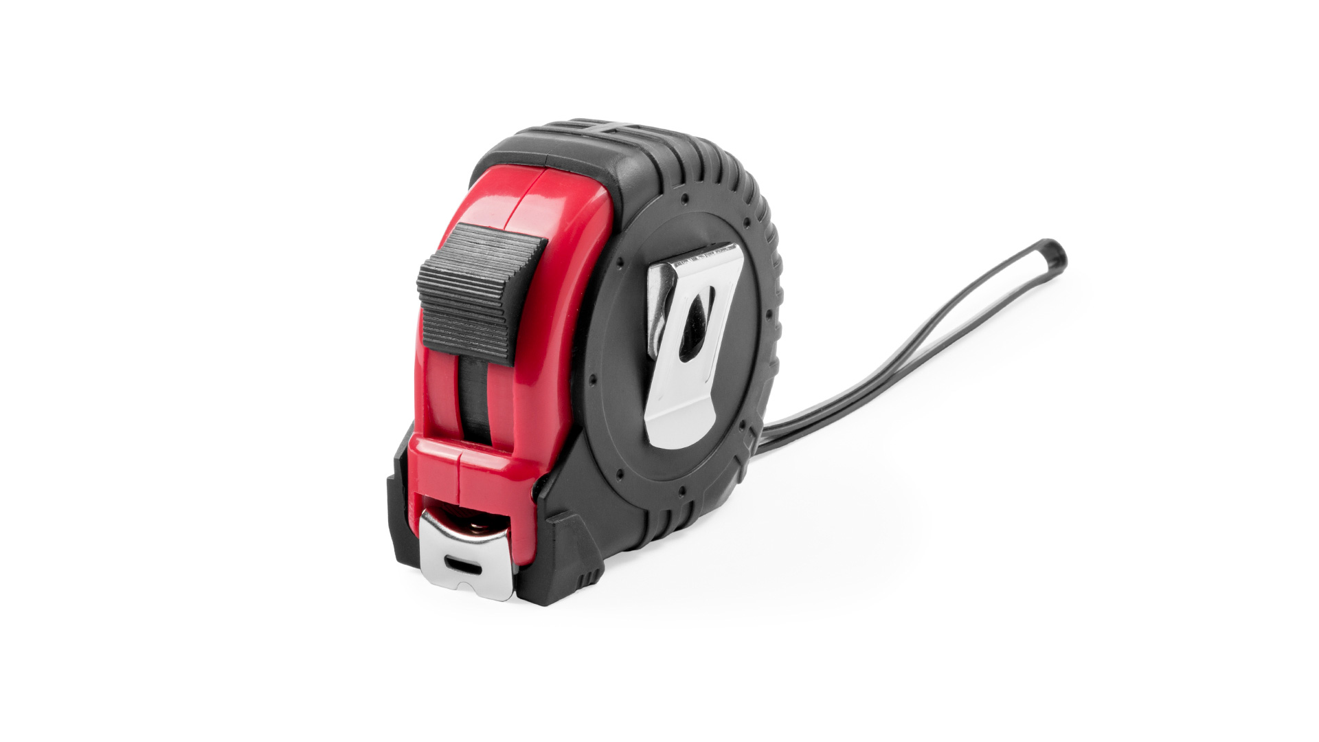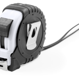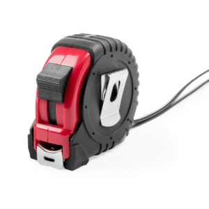 Flexómetro de 5 metros con cuchilla metálica y mecanismo de bloqueo. Con cuerpo de suave acabado en variados colores, recubierto con funda protectora de resistente goma, clip metálico para cinturón y cinta de transporte. Con troquelado especial para marcaje en doming/gota de resina y presentado en caja individual.