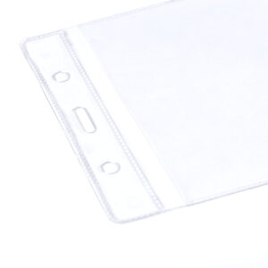 Identificador vertical de PVC. Práctico porta acreditaciones con parte superior reforzada y perforaciones tanto para la sujeción central como en los laterales.