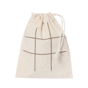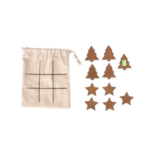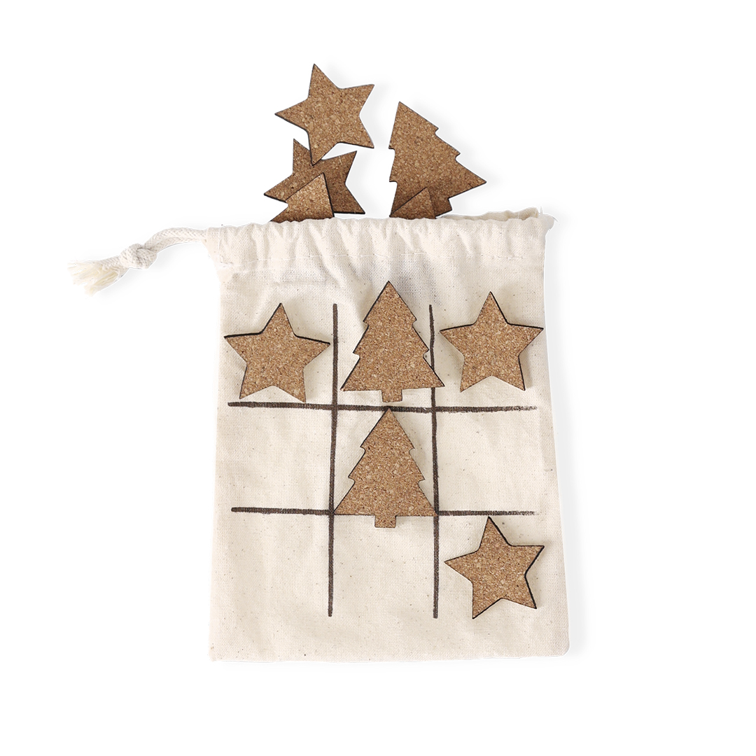 Juego de tres en raya fabricado en corcho natural. Incluye 5 fichas con forma de árbol y 5 fichas con forma de estrella. Presentado en bolsa de algodón con cierre de cordón