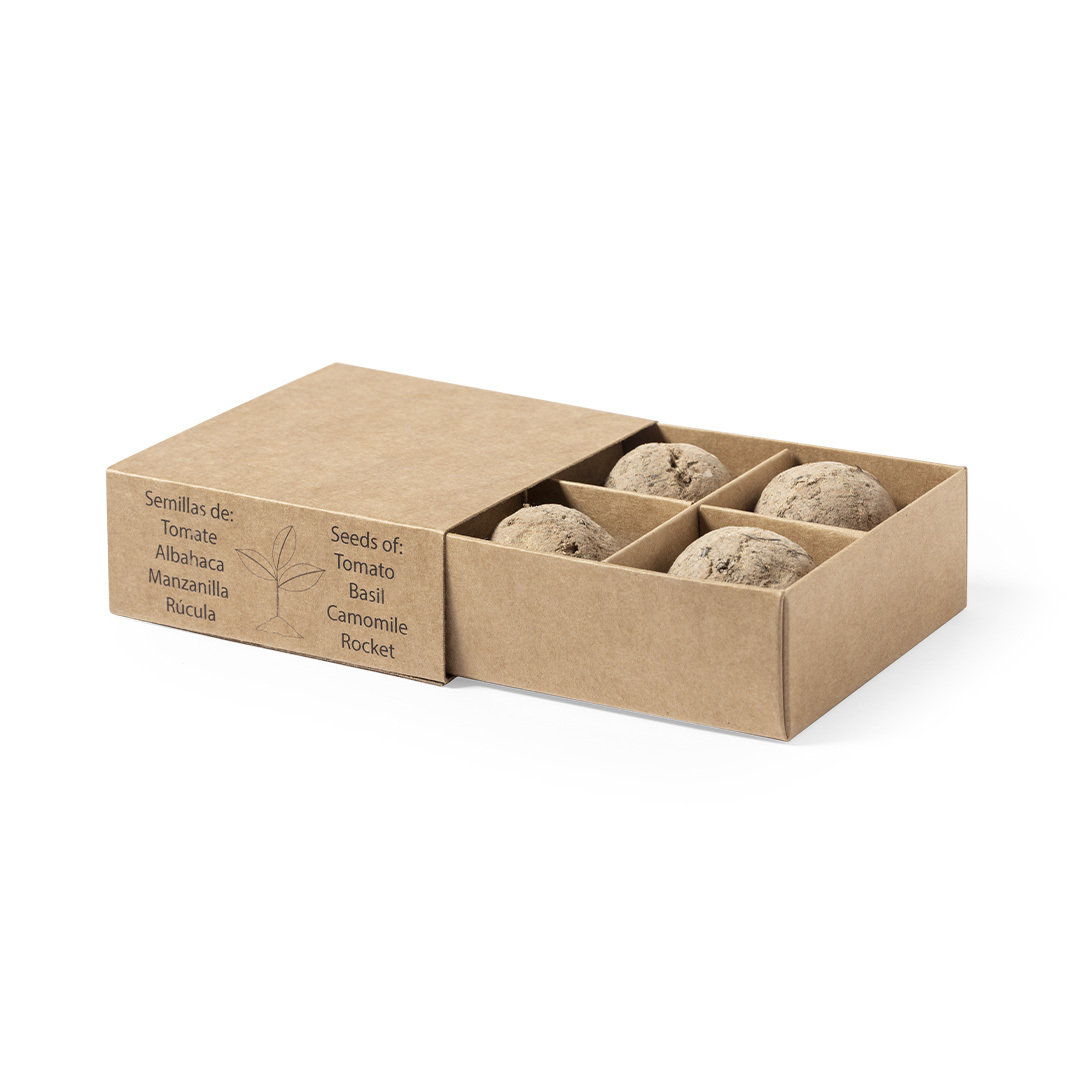 Kit huerto con semillas de tomate, albahaca, rúcula y manzanilla. Presentado en estuche de cartón reciclado con instruciones de plantado, distintivo Made in Europe y con 4 compartimentos independientes.