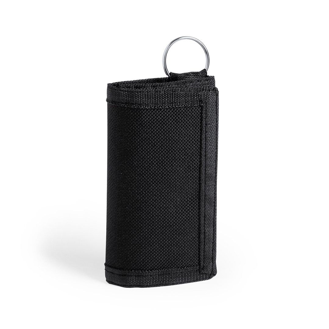 Llavero monedero en resistente poliéster 600D de vivos colores y cierre de velcro. Interior con monedero de cierre de cremallera, compartimento para tarjeta y anilla llavero.