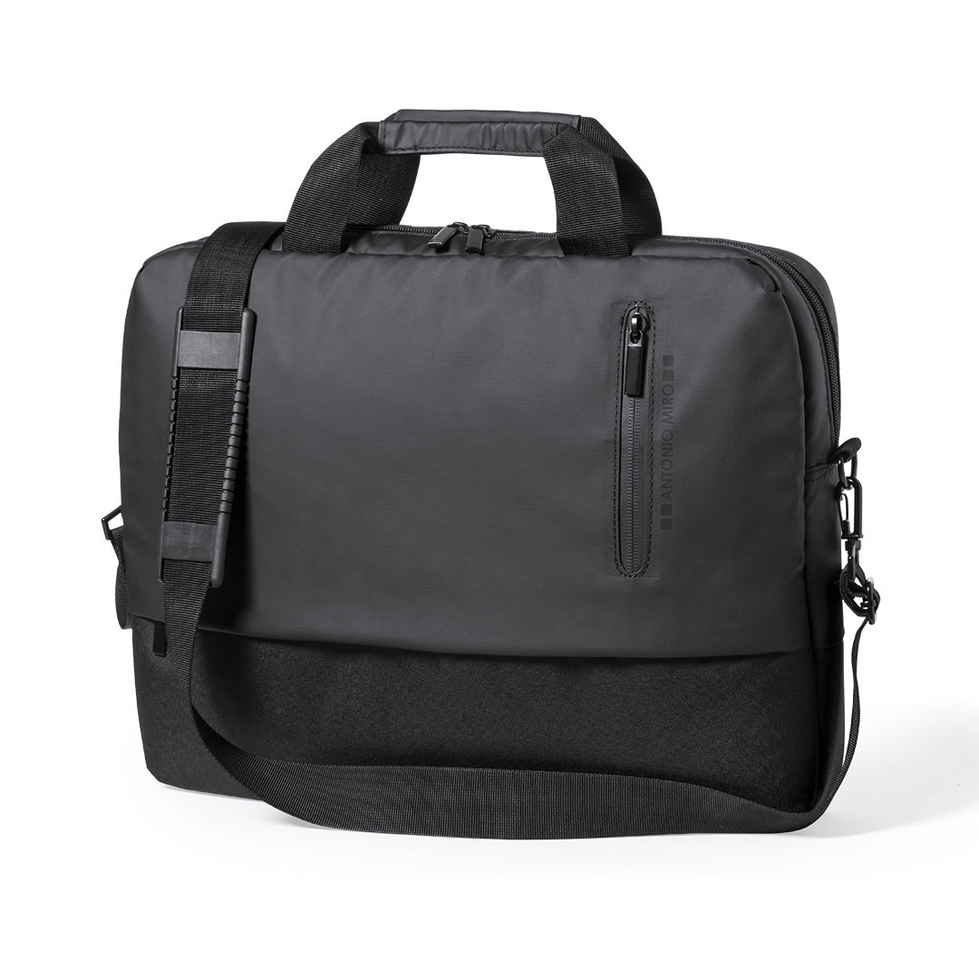 Maletín de Antonio Miró de calidad premium en resistente poliéster 600D. De sobrio diseño y con compartimento acolchado para portátil de hasta 15 pulgadas. Con cómoda asa de transporte reforzada, cierres de cremallera con tiradores metálicos y bolsillo frontal. Logotipo de la marca en frontal.