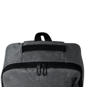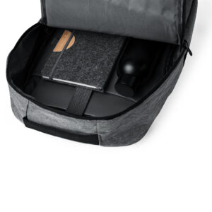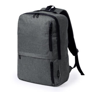 Mochila elaborada en resistente 600D RPET. Equipada con un cierre de cremallera de doble tirador y tres bolsillos frontales de acceso rápido. En su interior