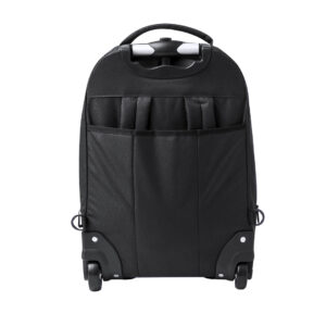 Mochila trolley de 2 ruedas en poliéster 300D de alta calidad. Incluye compartimento interior acolchado para ordenador portátil de hasta 15 pulgadas. Con asa exterior reforzada a juego y prácticos bolsillos en parte frontal. Con cremalleras a juego