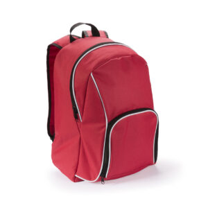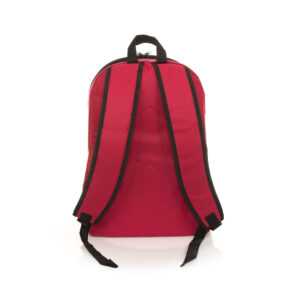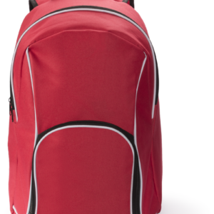 Mochila en resistente poliéster 600D de desenfadado diseño en variada gama de colores y con ribete de refuerzo en color blanco. Con cierre de cremallera de doble tirador, bolsillo frontal y bolsillos de redecilla elástica en los lados. Esquinas reforzadas y accesorios en negro. Espalda acolchada y cintas de hombros ajustables con acolchado.