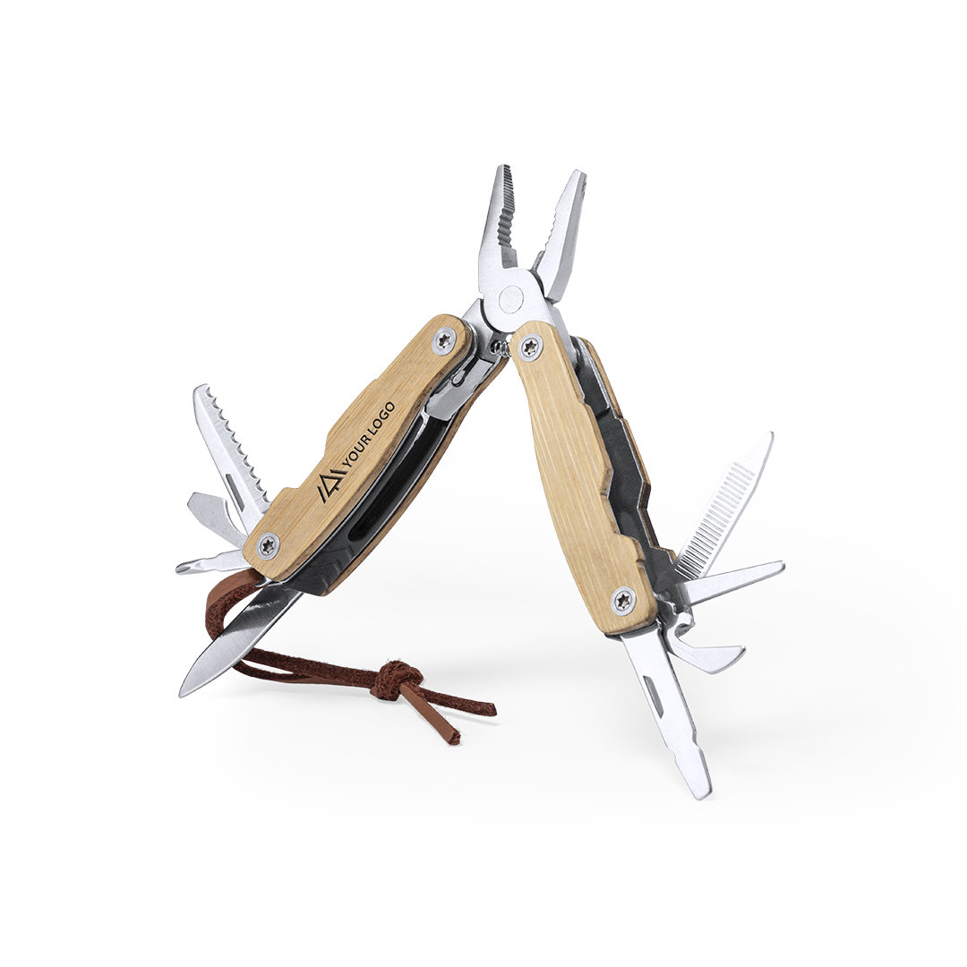 Multiherramienta con resistente cuerpo en acero inox y empuñadura de bambú, con 12 funciones. Incluye cuchillos y navajas destornilladores, limas abridores y alicates. Con cinta para transporte en polipiel y presentada en caja individual.