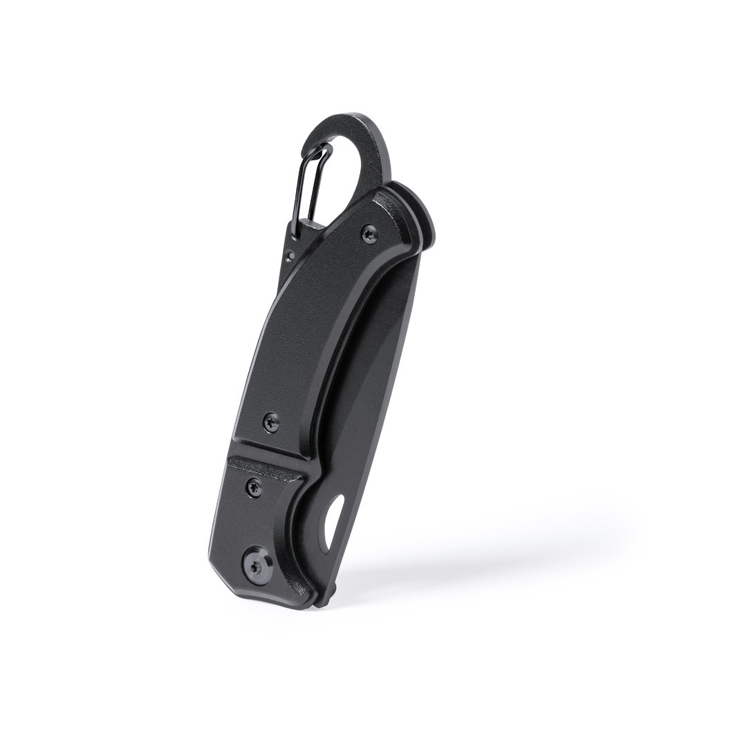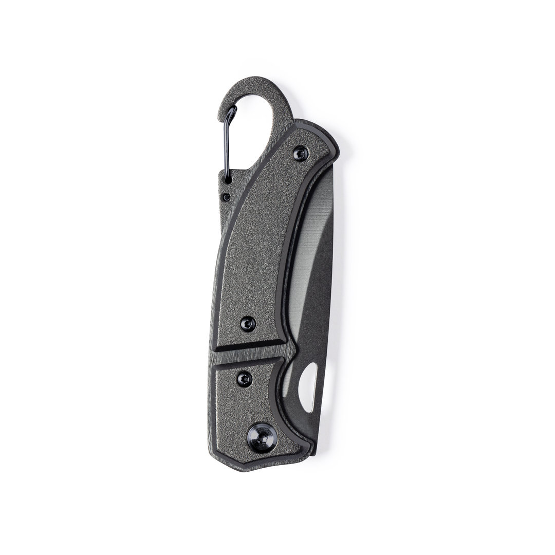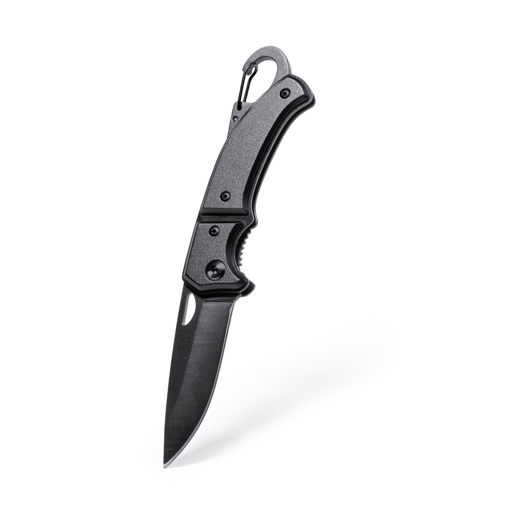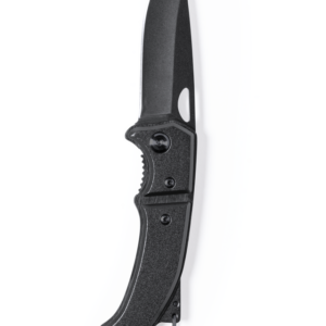 Navaja con hoja en acero inox de acabado negro y resistente empuñadura a juego en aluminio. Con mosquetón integrado en mango y bloqueo de seguridad. Con troquelado en hoja para una fácil apertura y presentada en caja individual de diseño negra.