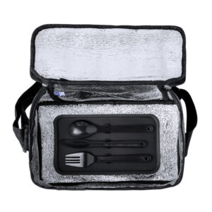 Nevera confeccionada en resistente poliéster 600D RPET con un atractivo efecto melange. Su compartimento principal cuenta con cierre de cremallera y forro interior de aluminio. Además