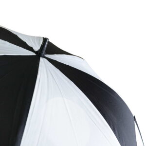 Paraguas de Golf de 8 paneles de sobrio diseño bicolor y 135cm de diámetro, de apertura manual. Fabricado en resistente material pongee, con sistema de seguridad antiviento. Varillas y eje de fibra en color negro, con cierre doble de velcro y suave mango a juego. Presentado en resistente funda del mismo material en color negro.