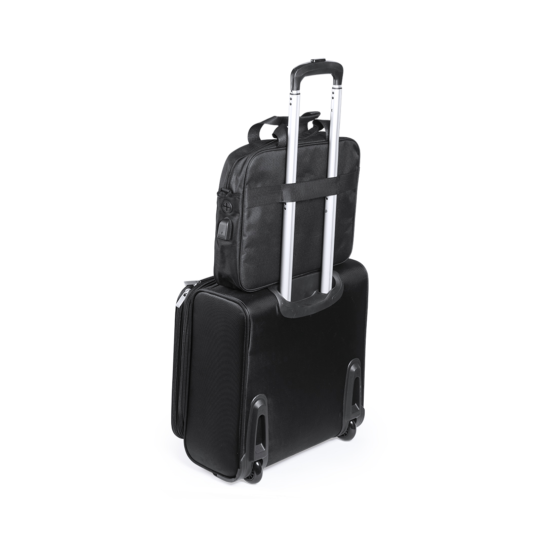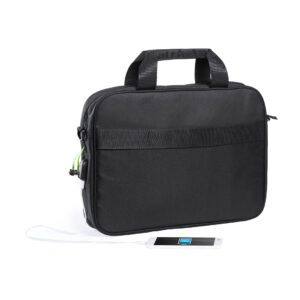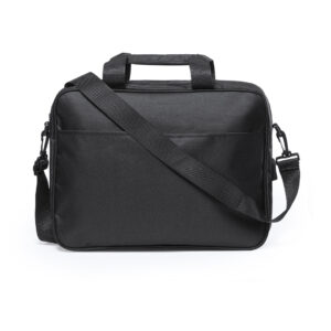 Portadocumentos en resistente poliéster 600D de acabado en color negro y de cierre de cremallera. Con salida para auriculares y compartimento interior con salida USB para conexión de powerbank -no incluido-. Con resistentes asas reforzadas y accesorio en la parte posterior para acople en barra de trolley. Interior con compartimento acolchado para ordenador portátil de hasta 15 pulgadas y compartimento para tablet de hasta 10 pulgadas. Con Multitud de bolsillos interiores y exteriores y cinta bandolera ajustable con cierre de mosquetón.
