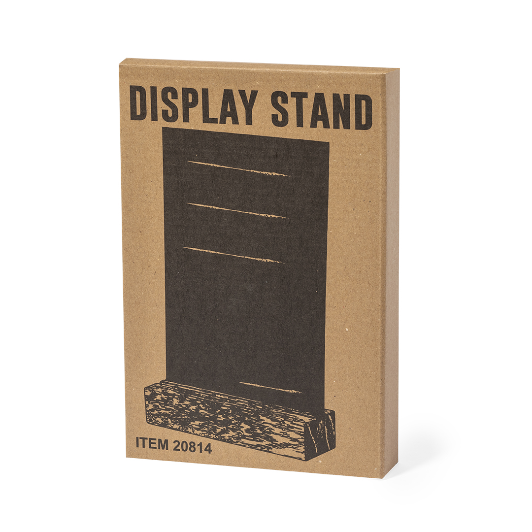 Portagráfica con base fabricada en resistente madera. Incluye práctica pizarra para escribir por ambos lados de la misma y viene presentada en caja individual de diseño kraft.