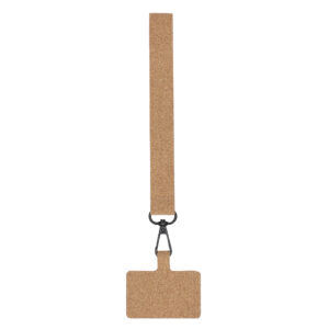Pulsera soporte para smartphone fabricada en corcho. Con cinta de transporte a juego y mosquetón metálico giratorio en color negro. Elaborado con elementos vegetales para así fomentar la utilización de materias primas naturales y reducir las emisiones contaminantes.