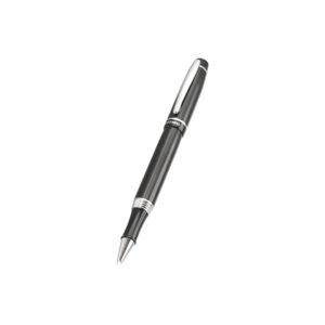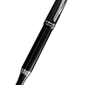 Roller de capucha de Antonio Miró en elegante diseño bicolor y suave cuerpo metálico en sobrio color negro. Con logotipo de la marca bajo la anilla, clip y punta en acabado plateado brillante. Presentado en estuche individual en color negro con logotipo de la marca. En tinta azul.