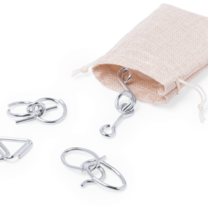 Set de 4 juegos de habilidad de acero inox para los jugadores más ingeniosos. Presentado en bolsita de color crudo con cordón de cierre auto ajustable.