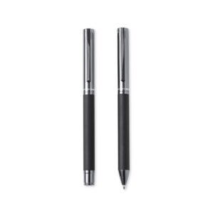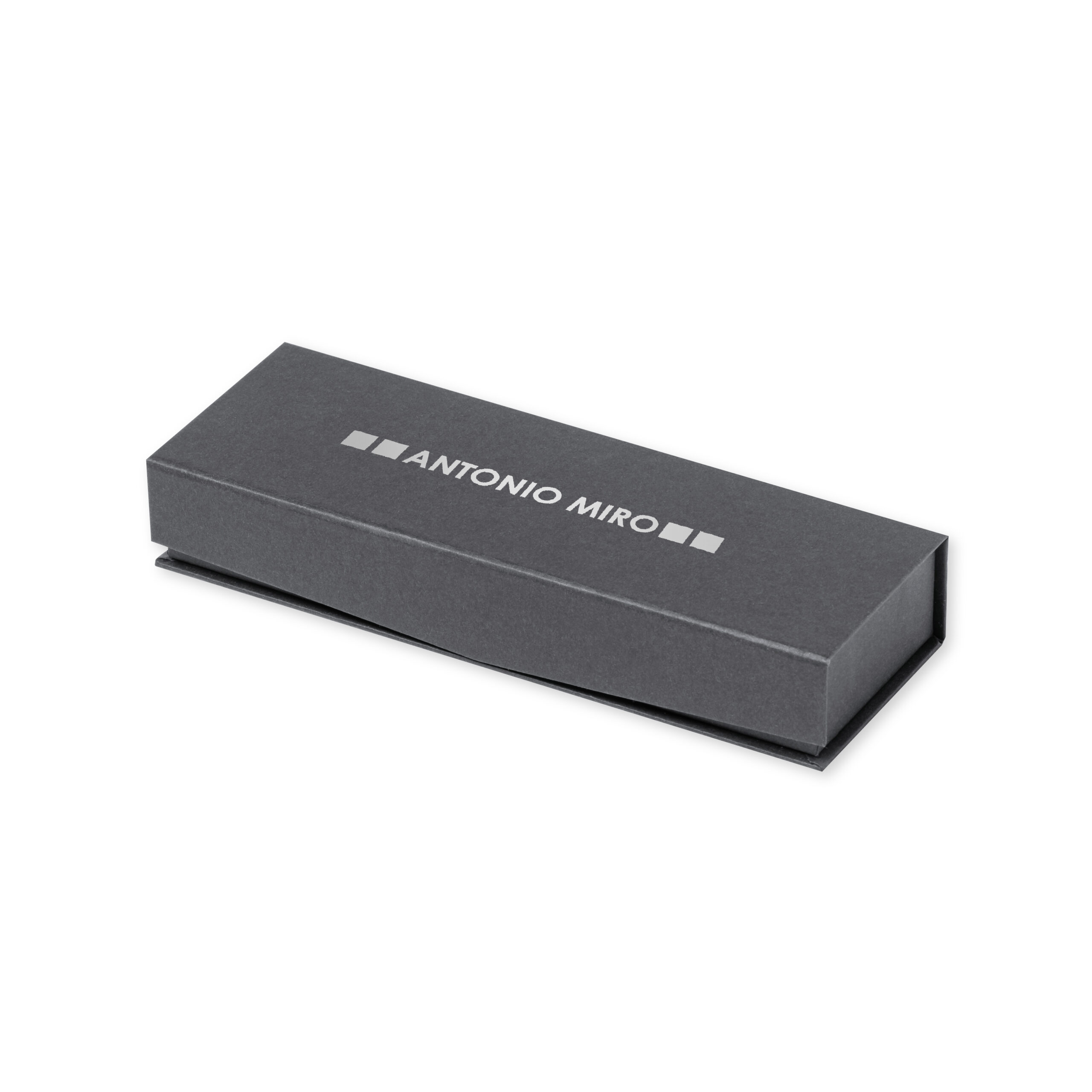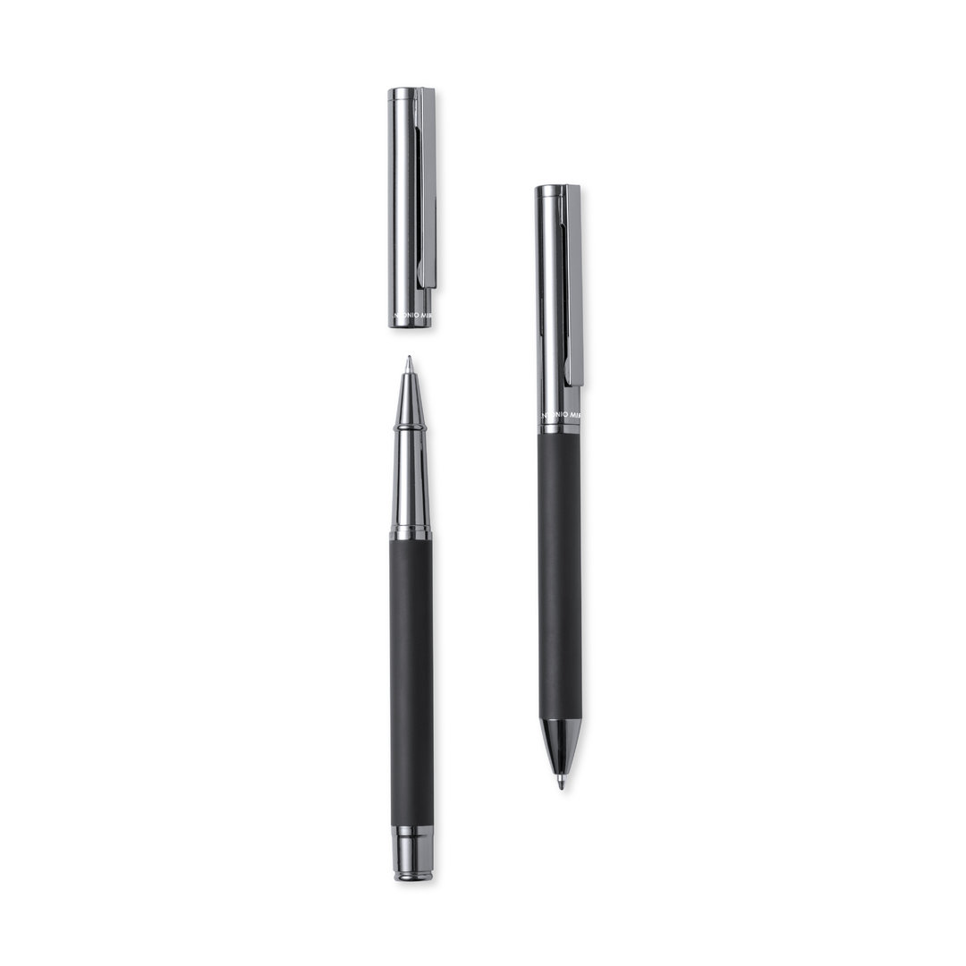 Set de bolígrafo y roller de Antonio Miró. Incluye: Bolígrafo metálico con cuerpo en negro mate. Detalles y capucha en cromado con logotipo de la marca cartucho jumbo y en tinta azul.Roller metálico con cuerpo en negro mate. Detalles y capucha en cromado con logotipo de la marca. Cartucho jumbo y en tinta azul.Presentado en elegante y resistente estuche individual negro con logotipo Antonio Miró