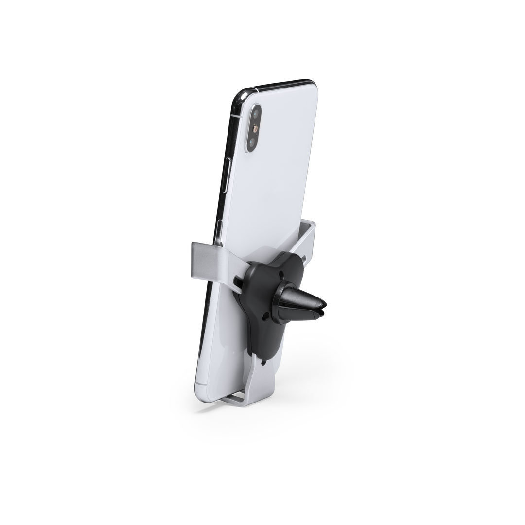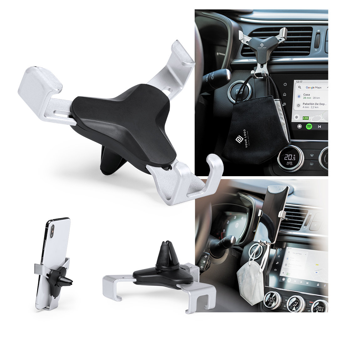 Ingenioso soporte para smartphone de diseño minimalista y especialmente diseñado para smartphones tamaño XXL. Con sistema de fijación universal que se activa por el propio peso del teléfono, ajustando las pinzas de agarre una vez que se sitúa el dispositivo en el soporte. Para rejilla de ventilación del automóvil y con frontal especialmente diseñado para marcaje en tampografía.