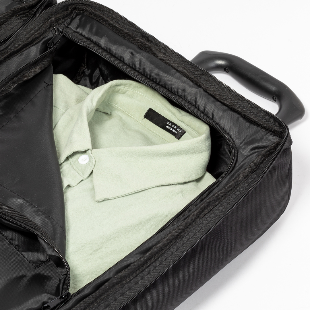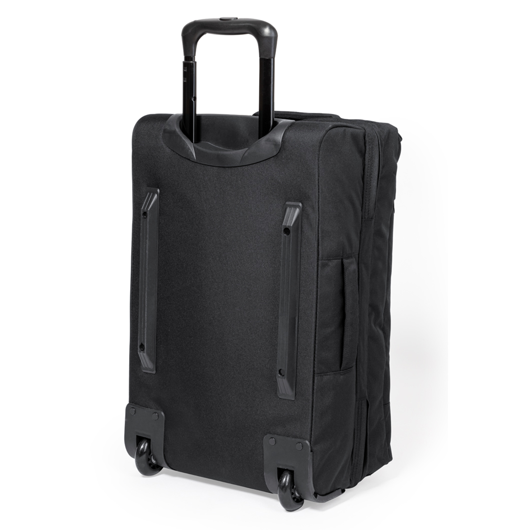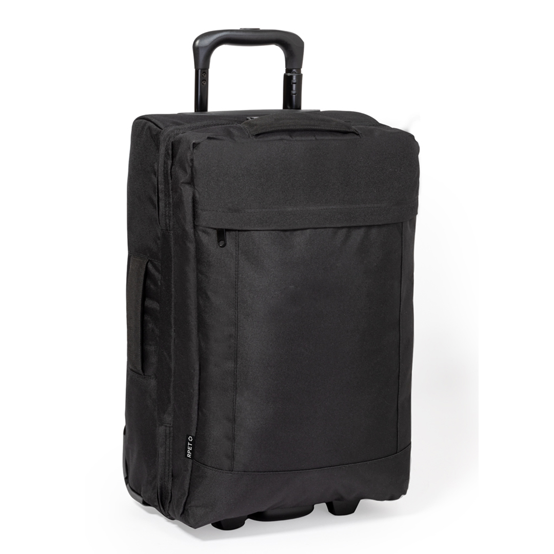 Trolley fabricado en resistente 600D RPET. Compartimento principal con cierre de cremallera de doble tirador conforme a los estándares TSA -Administración de la Seguridad en el Transporte-