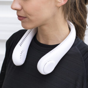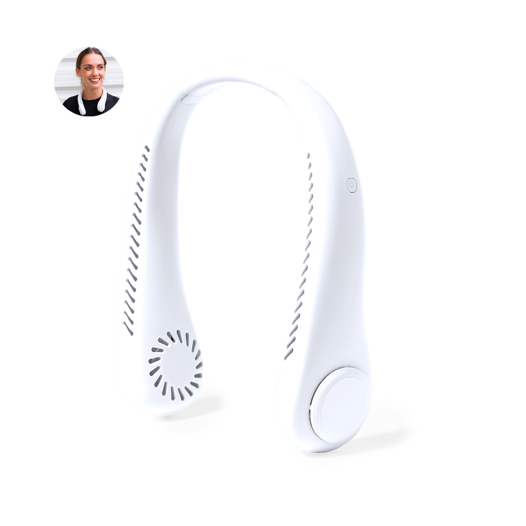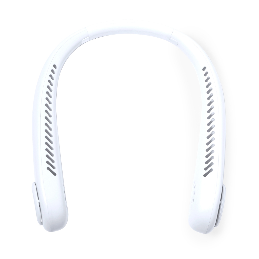Práctico ventilador portátil fabricado en resistente ABS. Este elegante ventilador tiene un diseño en forma de collar para colocarlo alrededor del cuello
